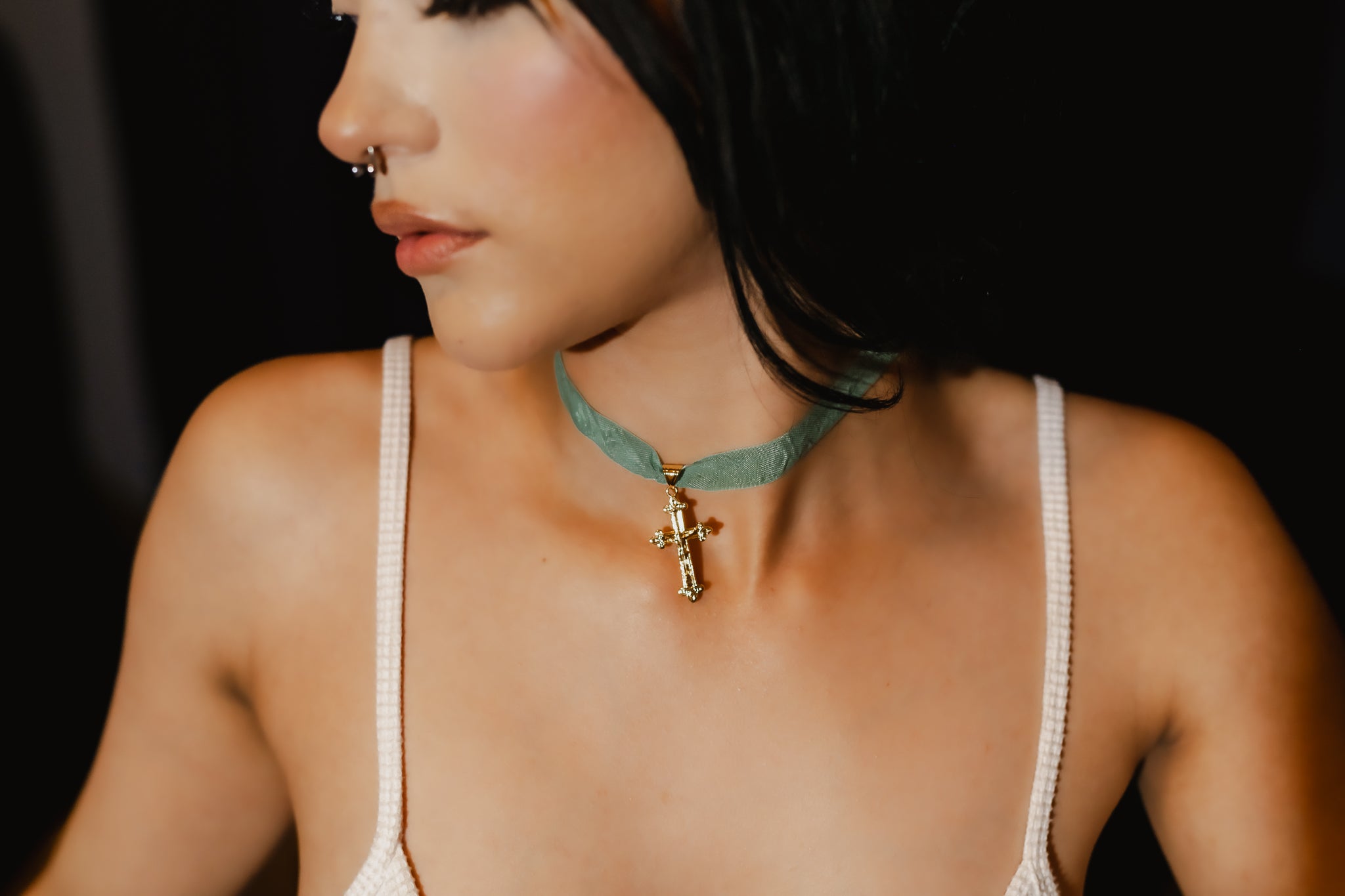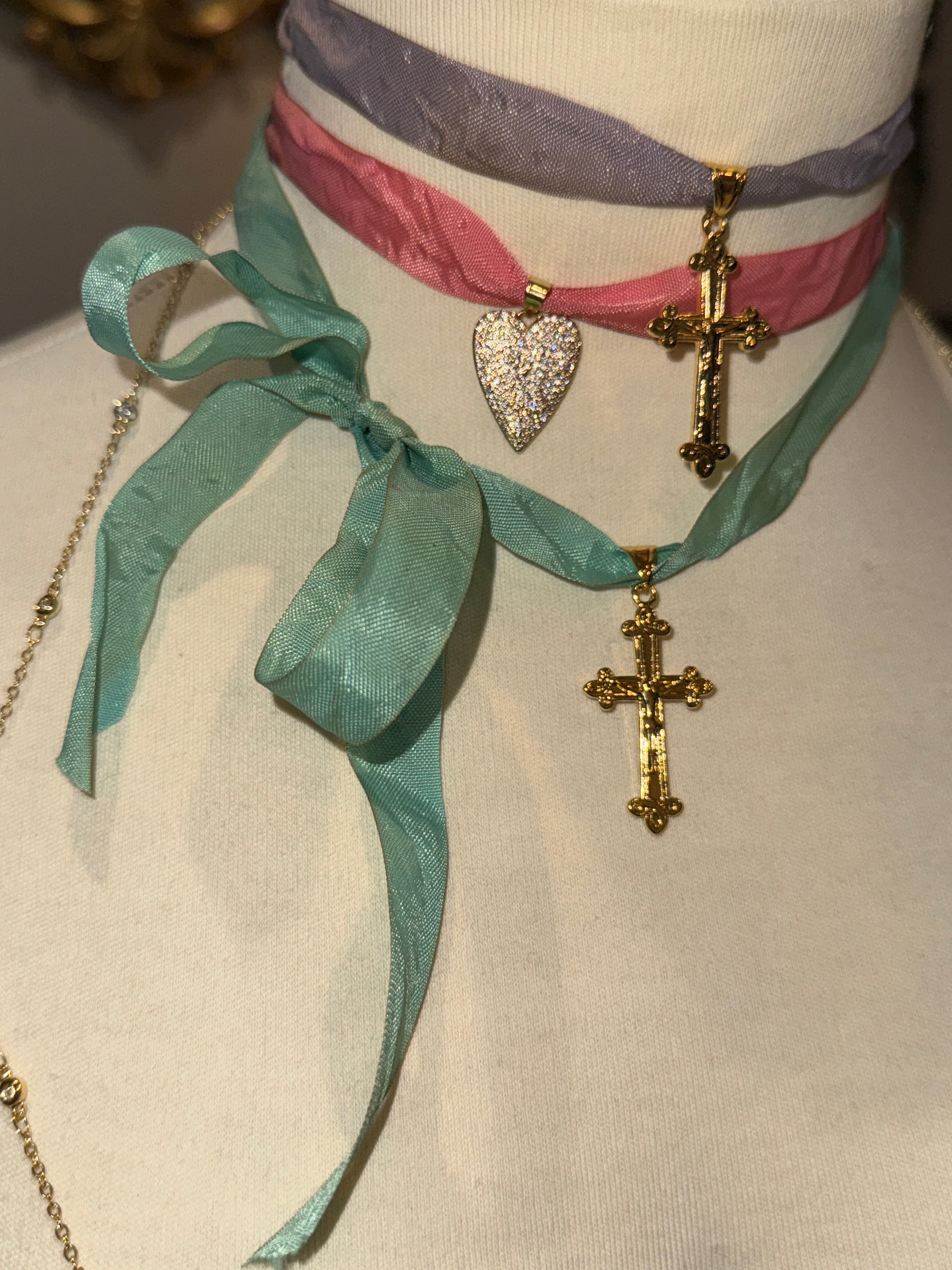 Details: this choker style necklace features a brilliant gold plated cross charm and hangs delicately from a silky aqua blue antiqued ribbon