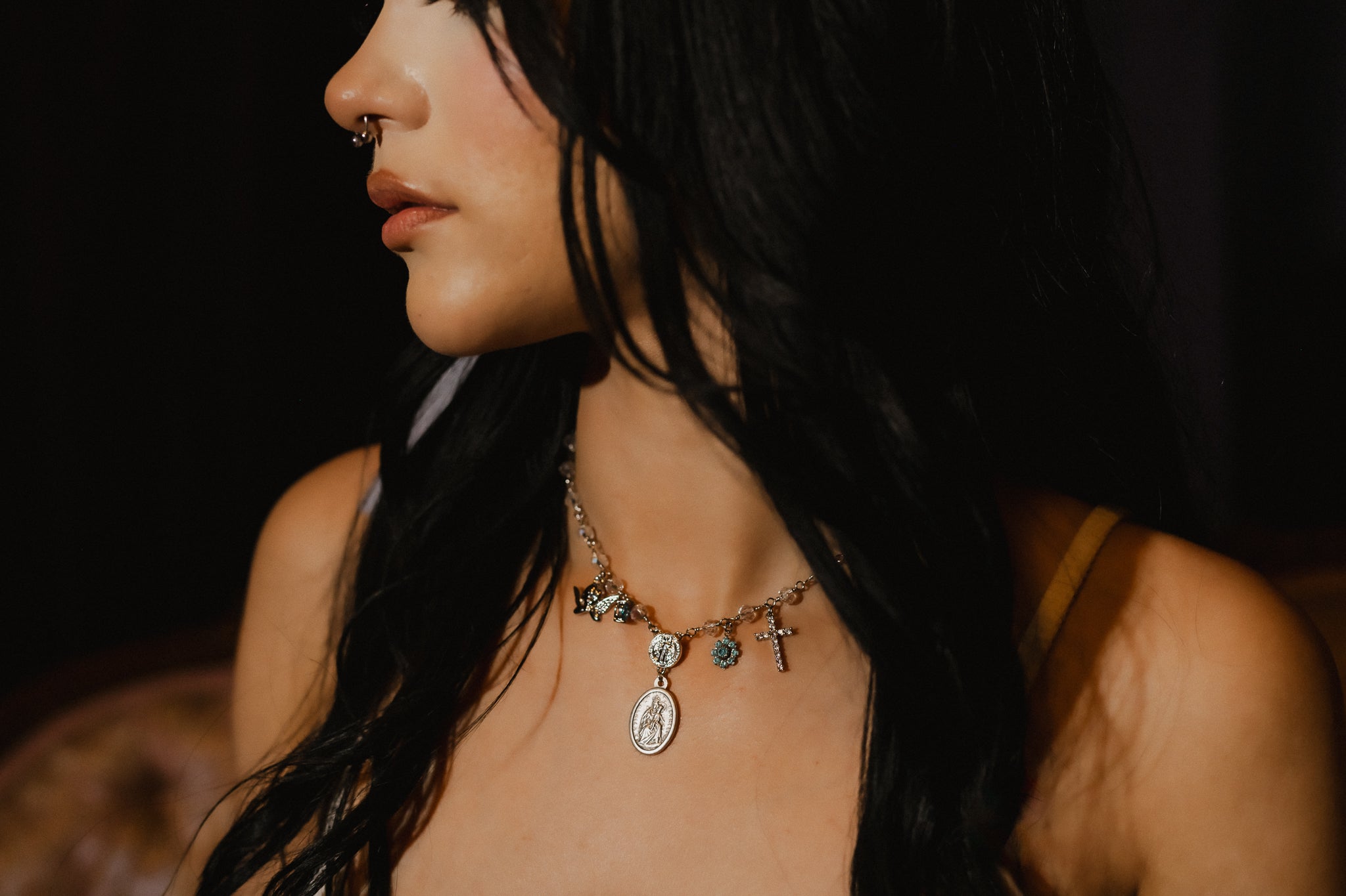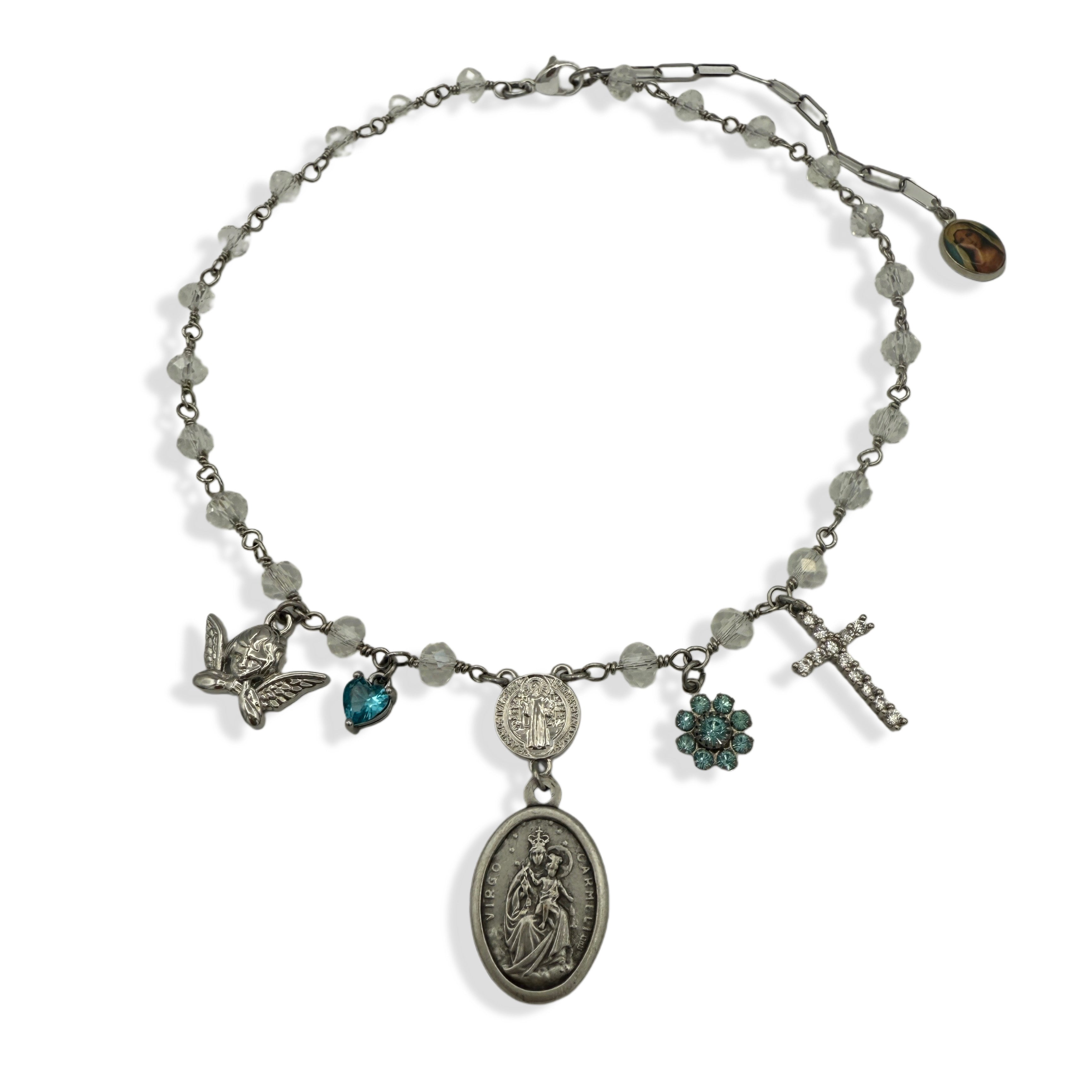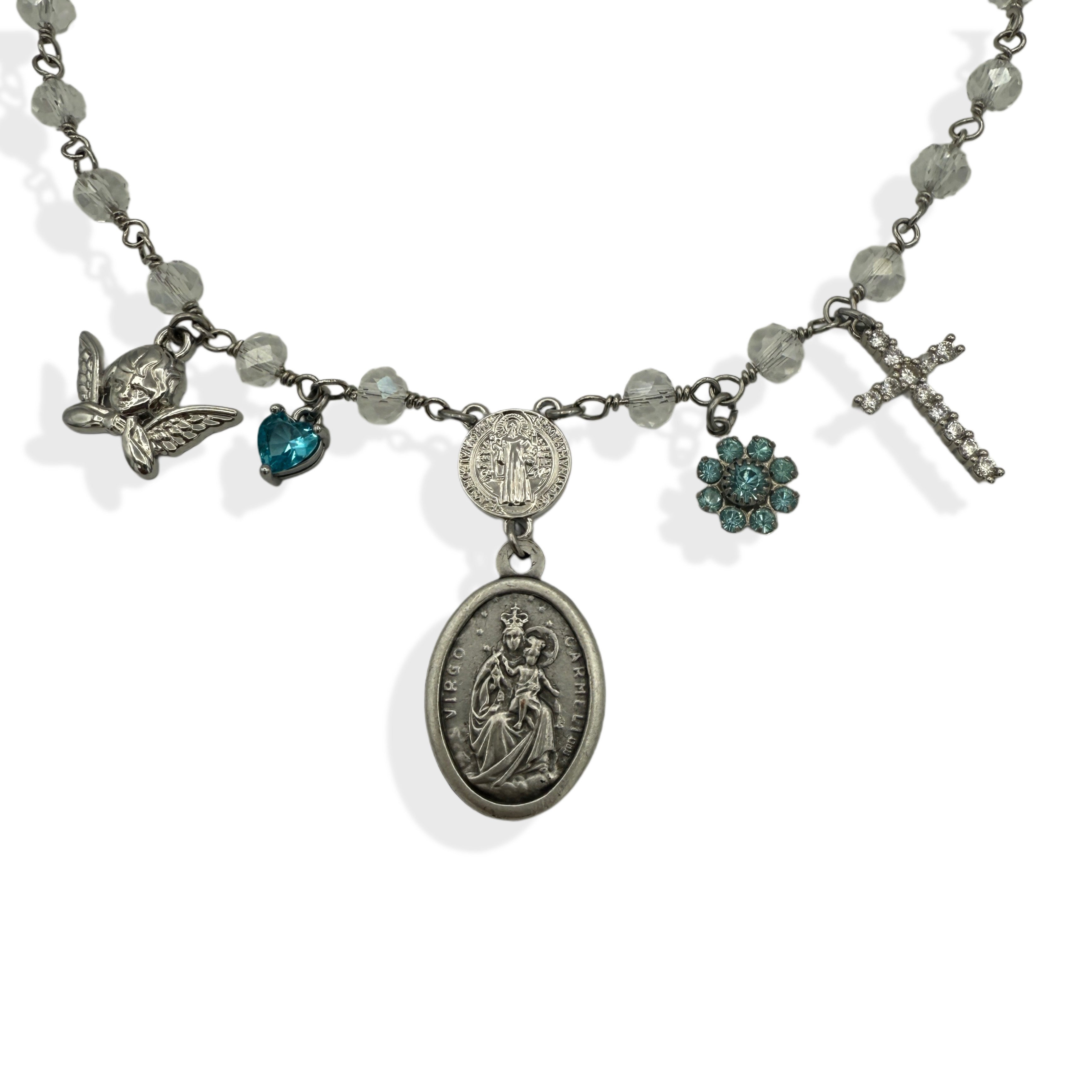 ♥ Details: this may be the perfect rosary inspired charm necklace. the medal of the virgin of carmel 'virgo carmeli' as its center piece, hangs from a saint benedict charm, accompanied by an cherub charm, a light blue cz heart crystal charm, a light blue vintage swarovski flower charm, and a clear crystal cz cross charm. strung on an onyx faceted beaded crystal stainless steel plated chain.