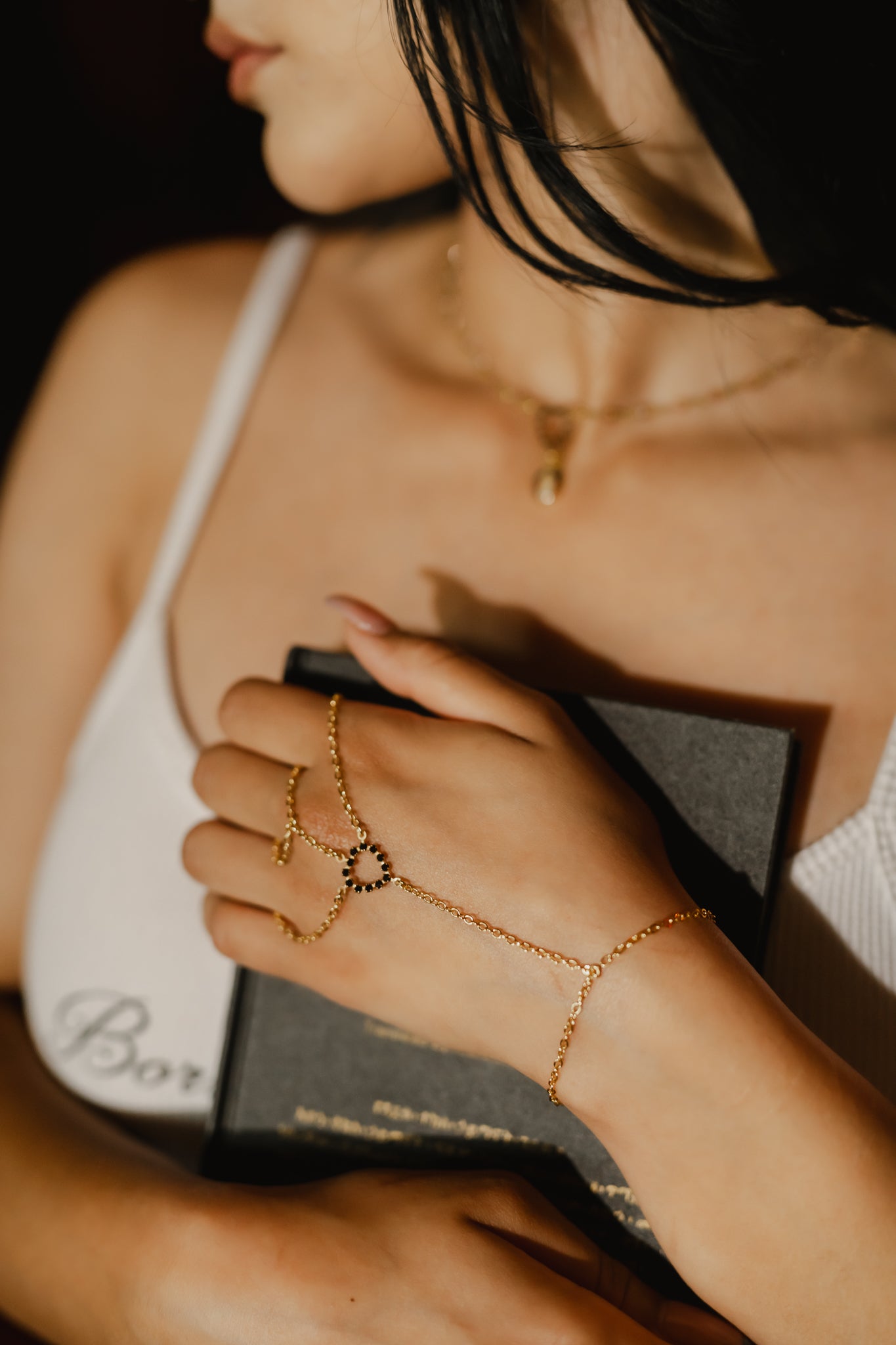 Details: unlike most hand chain style bracelets, this hand made piece wraps around the ring and the index finger. inspired by the rosary, its centerpiece, a vintage discontinued swarovski crystal deep ruby red heart charm.