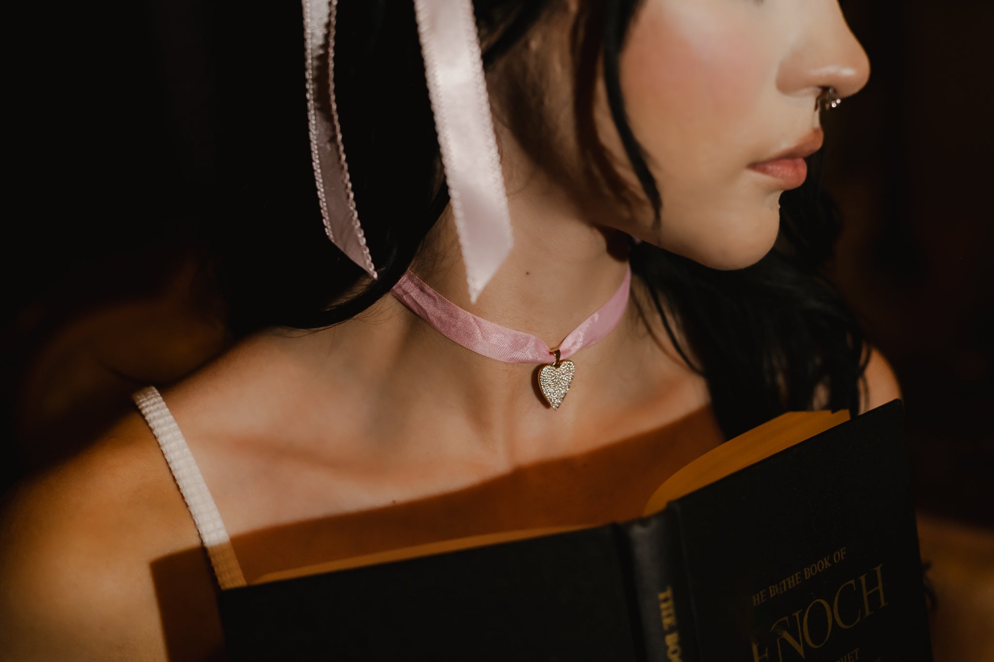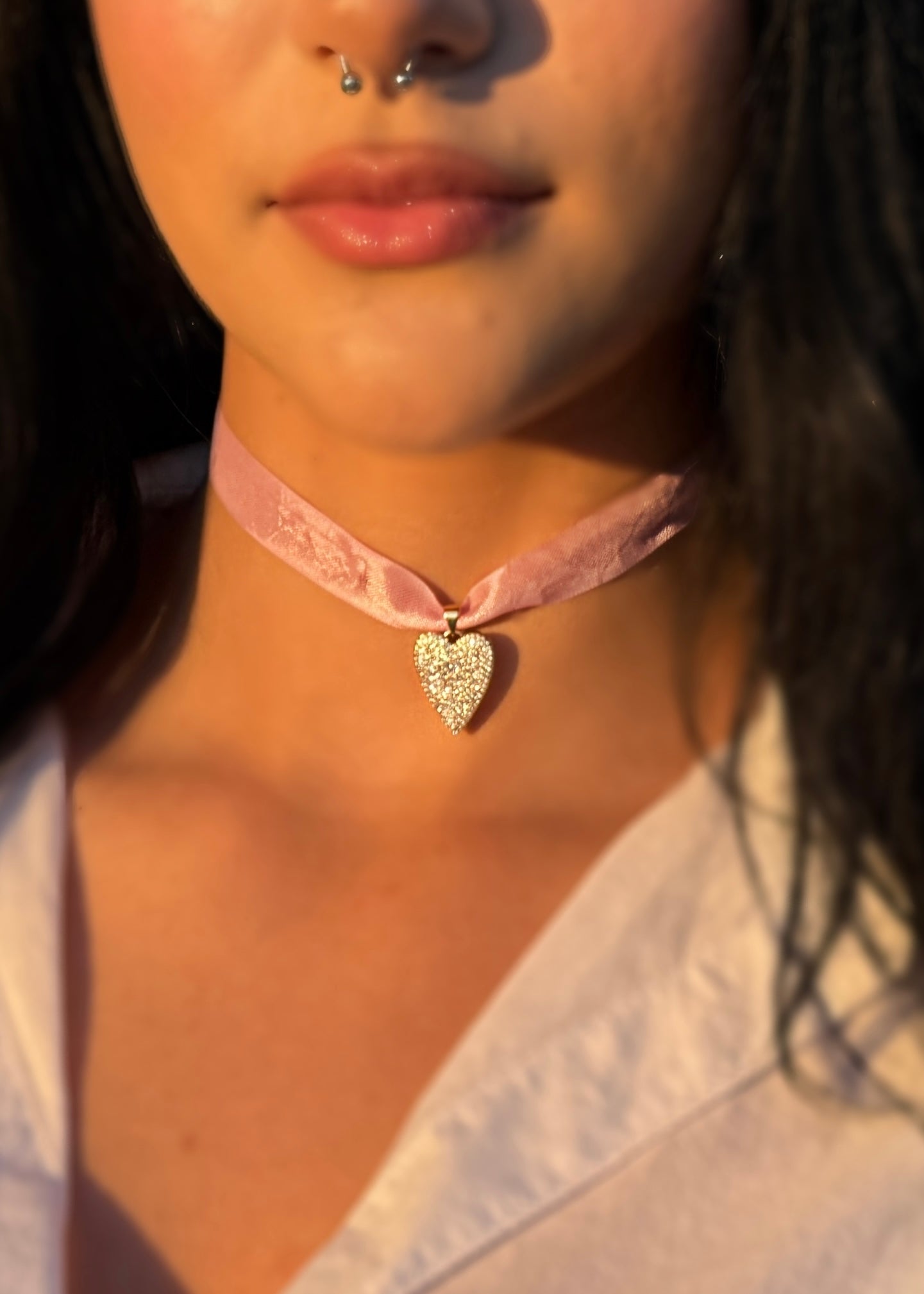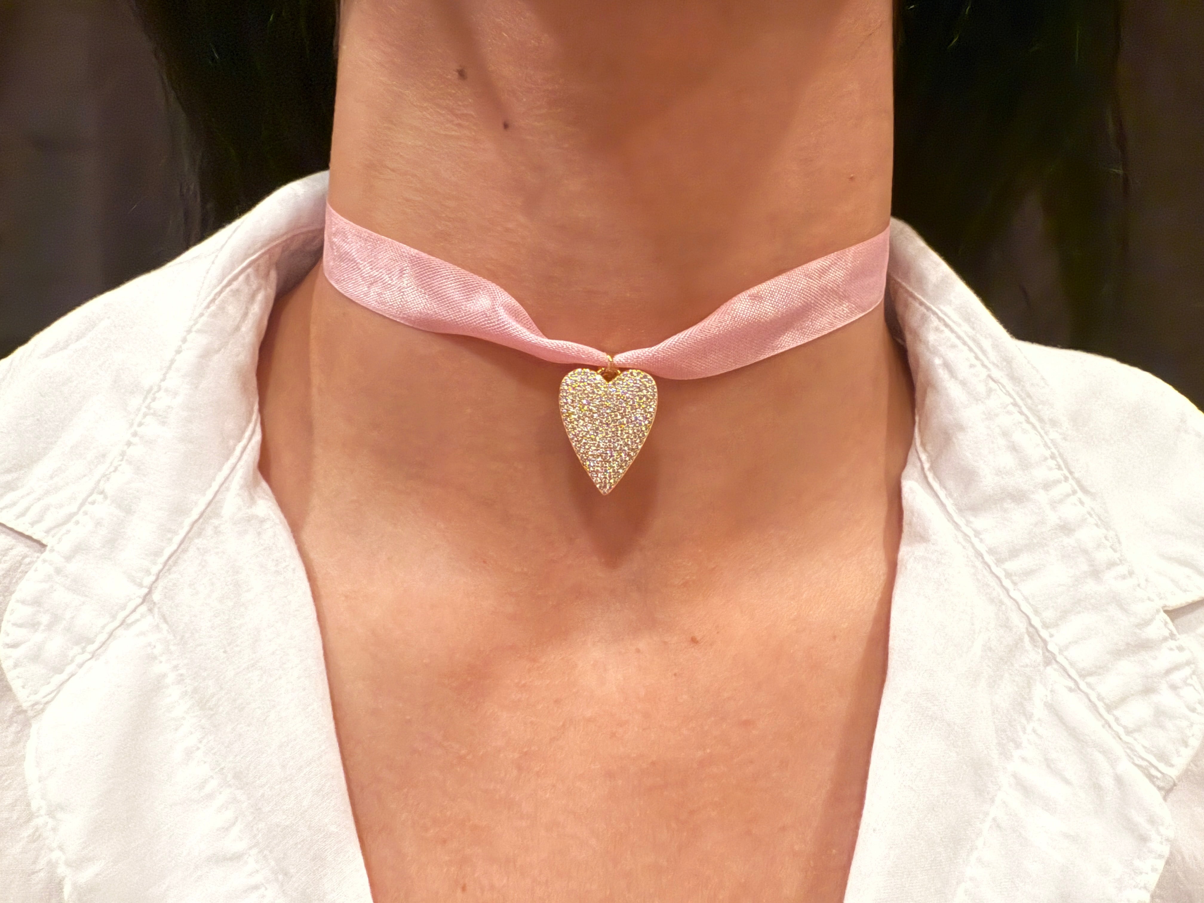 ♥ Details: this choker style necklace features a brilliant pave cz crystal rhinestone heart charm, and hangs delicatly from a silky baby pink antiqued ribbon