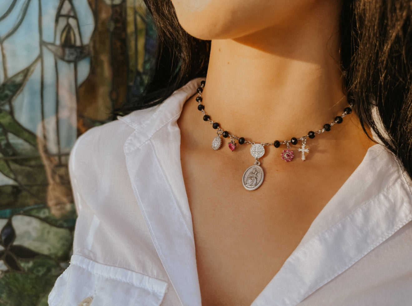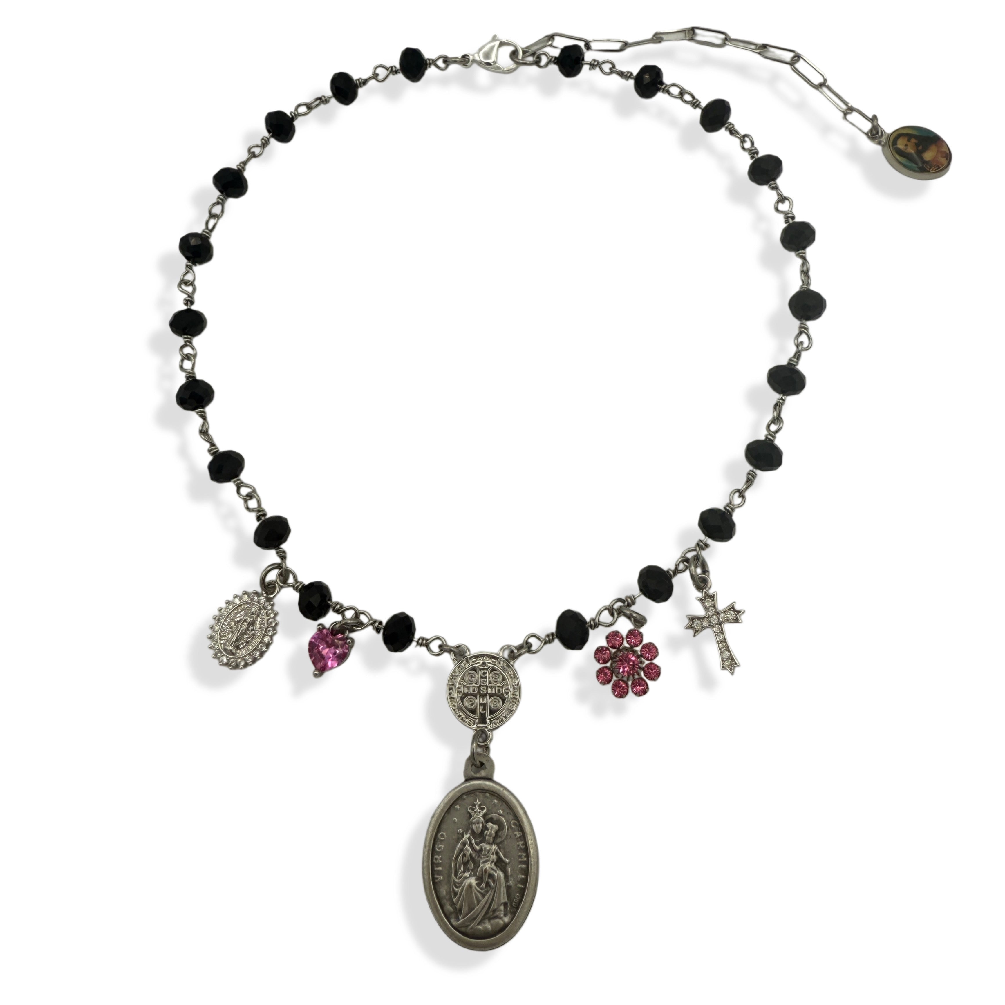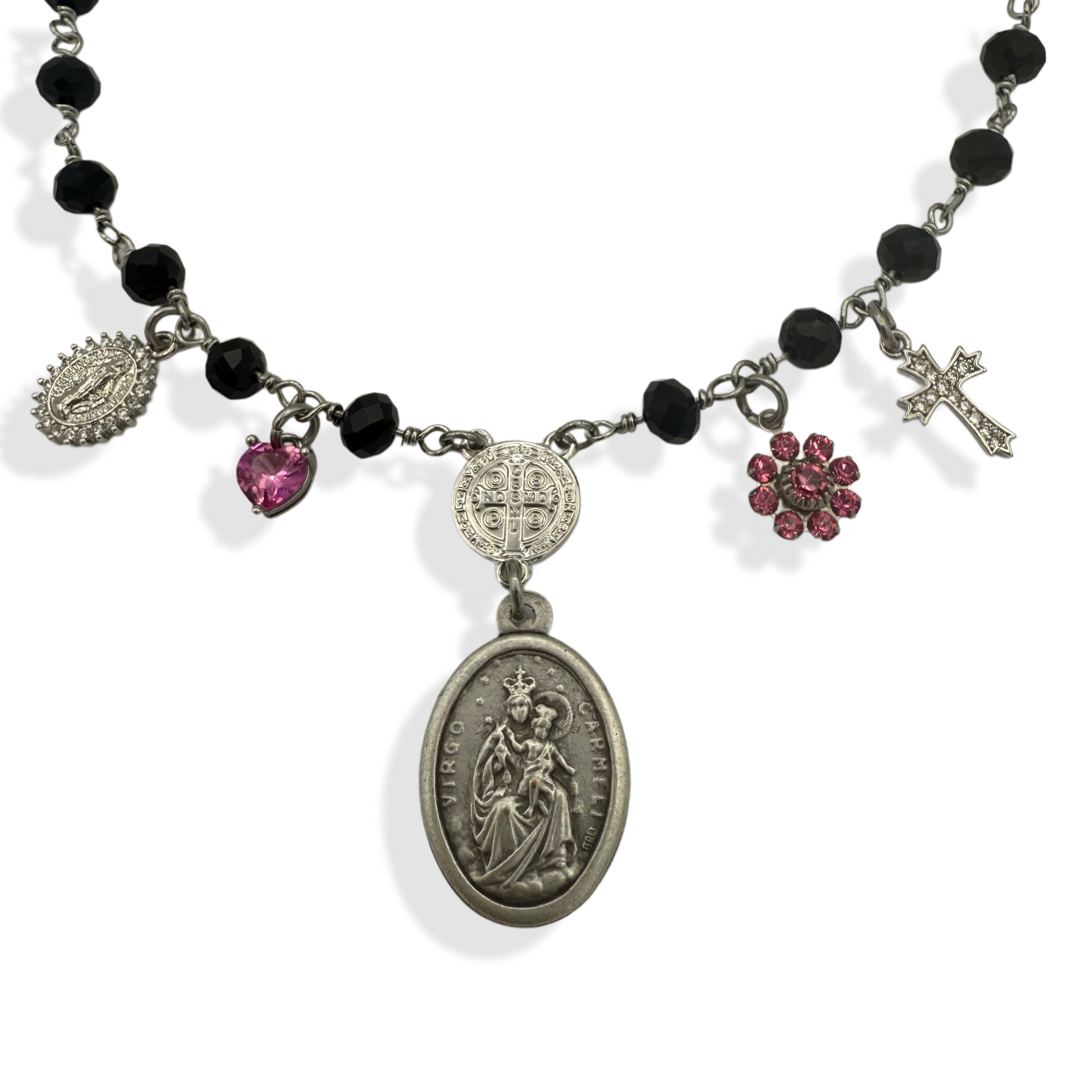 ♥ Details: this may be the perfect rosary inspired charm necklace. the medal of the virgin of carmel 'virgo carmeli' as its center piece, hangs from a saint benedict charm, accompanied by a mini miraculous medal charm circled in cz crystals, a pink cz heart crystal charm, a vintage swarovski flower charm, and a clear crystal cz cross charm. strung on an onyx faceted beaded crystal stainless steel plated chain.